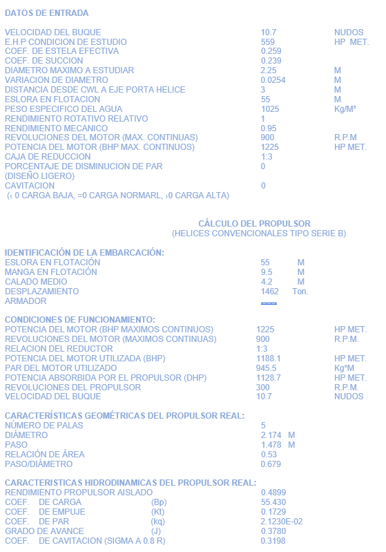 En este cálculo se determina el tipo de hélice, Número de palas, Diámetro, Paso, Relación de área (ancho de la pala) e inclinación de las palas, para que la embarcación navegue a la velocidad deseada con el menor consumo de combustible, posteriormente se construye la hélice con características idénticas a las determinadas en el cálculo.