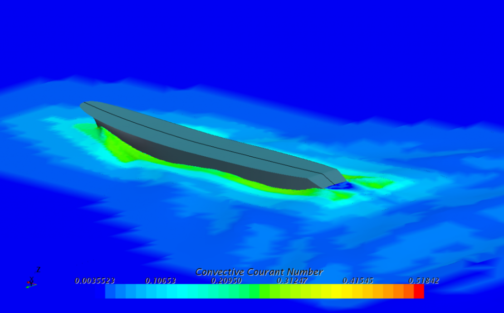 Este cálculo se inicia con la determinación de la resistencia al avance del casco para distintas velocidades de la embarcación, para lo cual se pueden utilizar modelos paramétricos, matemáticos o físicos. A continuación se presentan imágenes de un modelo matemático (CFD) y de un modelo físico ensayado en un canal de pruebas, con estos resultados y la simulación de un propulsor se determina la potencia necesaria del motor propulsor.